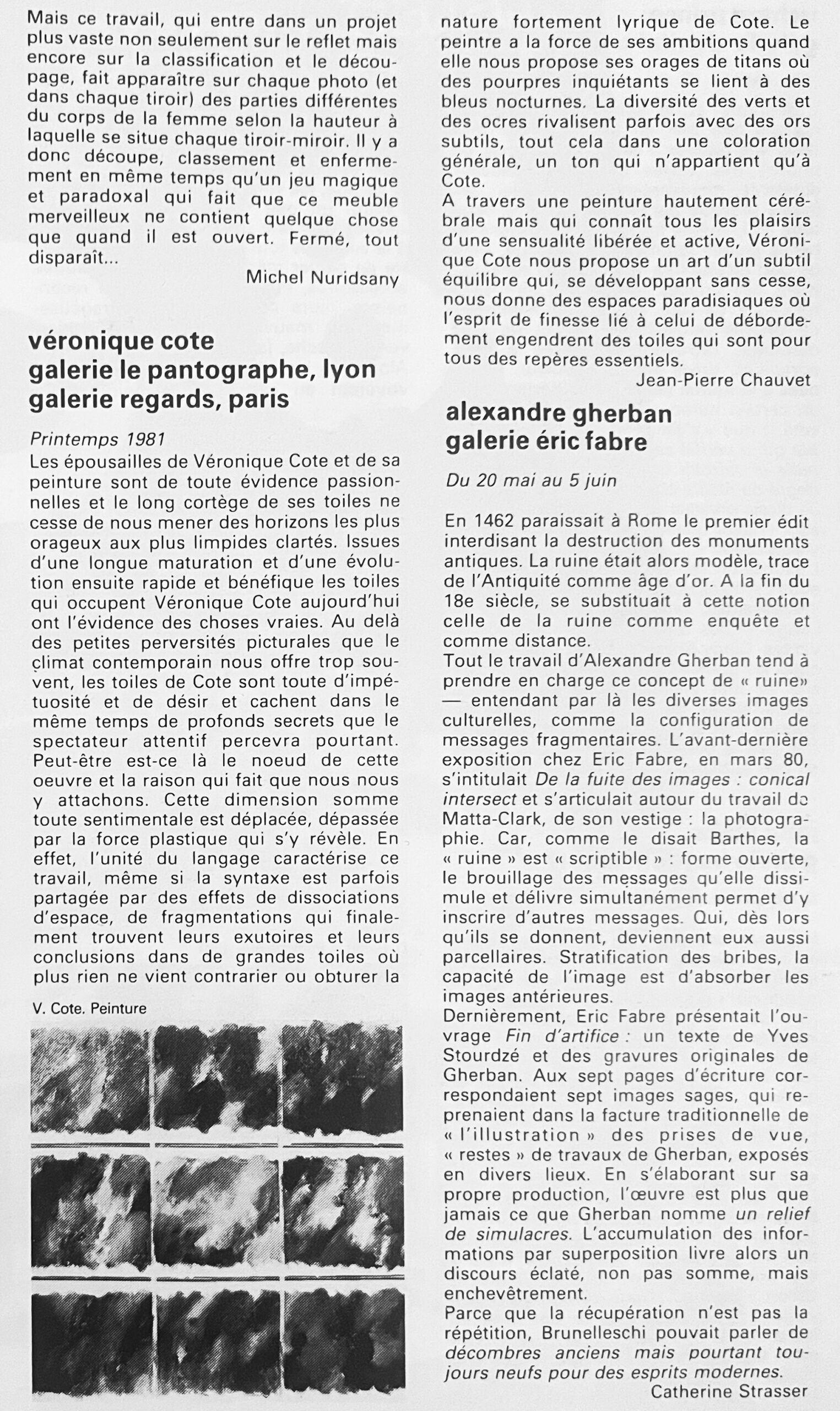 “Véronique Cote, galerie Le Pantographe, Lyon, galerie Regards, Paris”, Art Press N°51, Paris, 1981